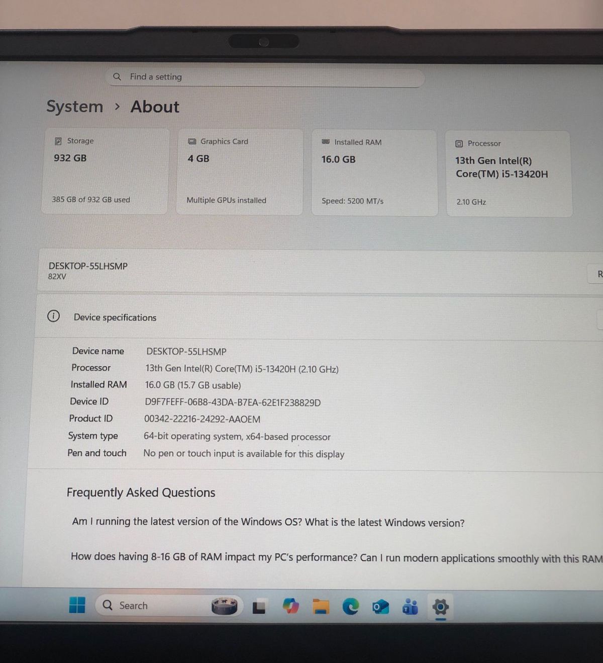 Installed RAM 16 GB